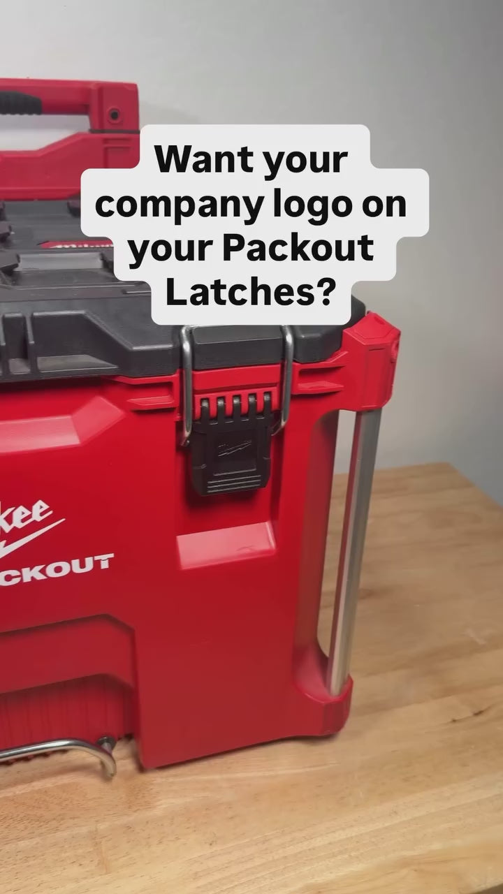 Custom latches and labels for Milwaukee Packout. All latches are black with colored text or logo elements. Use the editor to preview your design before ordering. Sold individually or in pairs at a discount. Packout not included.